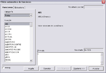 OpenOffice.org Calc nos permite utilizar diversas funciones, éstas están clasificadas por categorías.